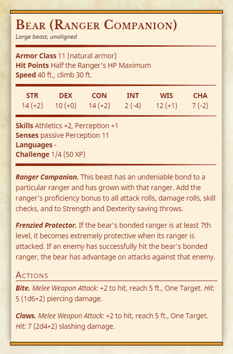 The Beast Master archetype embodies a friendship between the civilized races and the beasts of the world. United in focus, beast and ranger work as one to fight the monstrous foes that threaten civilization and the wilderness alike. Emulating the Beast Master archetype means committing yourself to this ideal, working in partnership with an animal as its companion and friend.