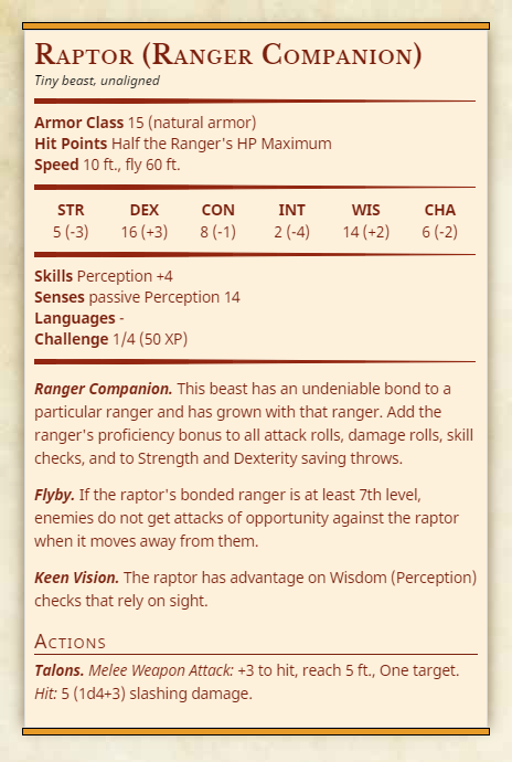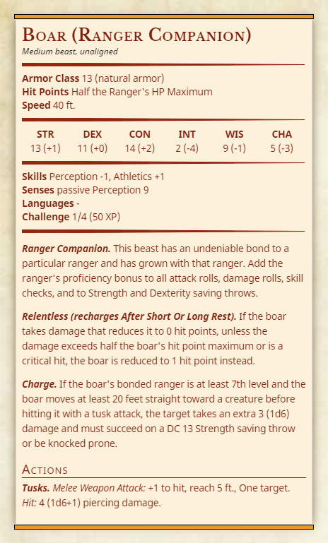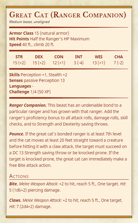 At 3rd level, you gain a beast companion that accompanies you on your adventures and is trained to fight alongside you. Choose one of the beast templates shown below. Your beast companion's hit points equal half the ranger's hit point maximum and increase each level when the ranger's hit point maximum increases. Use the abilities and bonuses shown in the template, but add the ranger's proficiency bonus to all attack rolls, damage rolls, skill checks, Strength and Dexterity saving throws made by the animal companion.